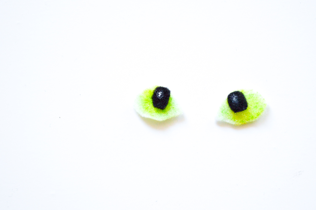 Die Augen bestehen aus weißem Filz, der mit zwei grüntönen bemalt ist und je einem kleinen Stückchen schwarz mit einem Glanzlicht aus Edding. Die Augenelemente werden mit je einem Tropfen Batselkleber zusammengesetzt und später ebenfalls mit etwas Klebstoff am Kopf befestigt.