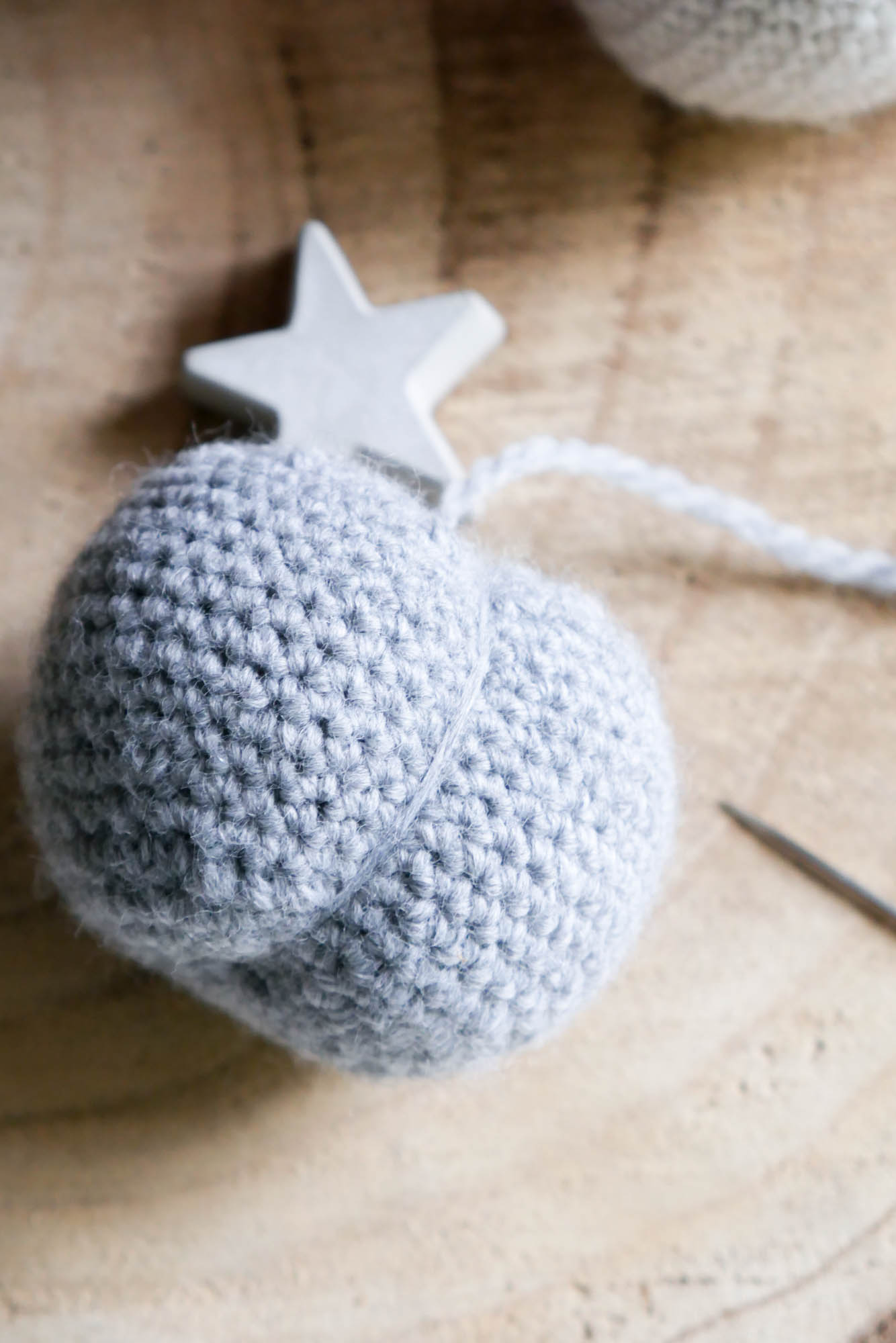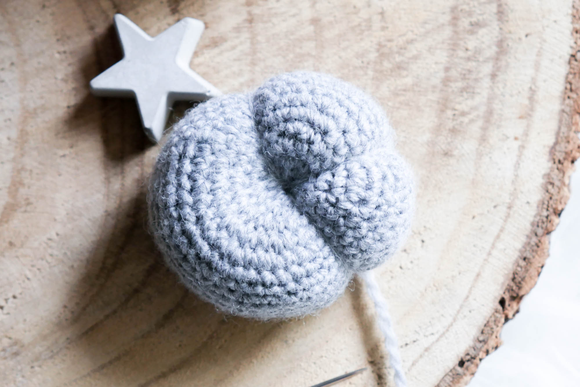 Ich habe einen weißen Kürbis mit 26 Runden gehäkelt und den kleineren, grauen mit der 20 Runden Version der Anleitung.