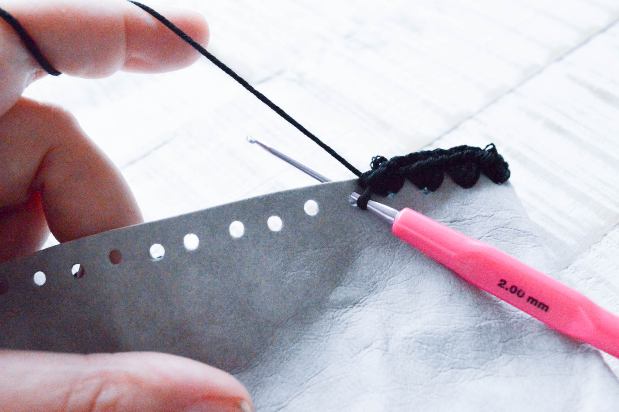 Zunächst müsst ihr aber das Leder mit der Wolle verbinden. Hierfür umhäkelt ihr das Leder indem ihr in jedes Loch drei Maschen häkelt. So bekommt ihr ein schönes Zick-Zack Muster am Übergang und bekommt genug Maschen, dass die Tasche nicht enger oder weiter wird als das Lederteil.