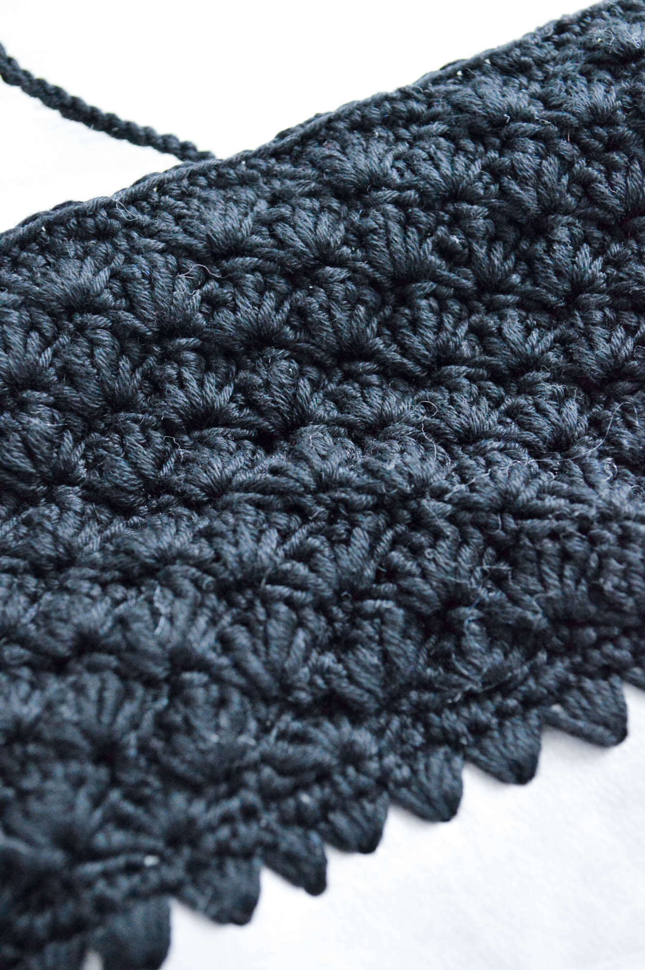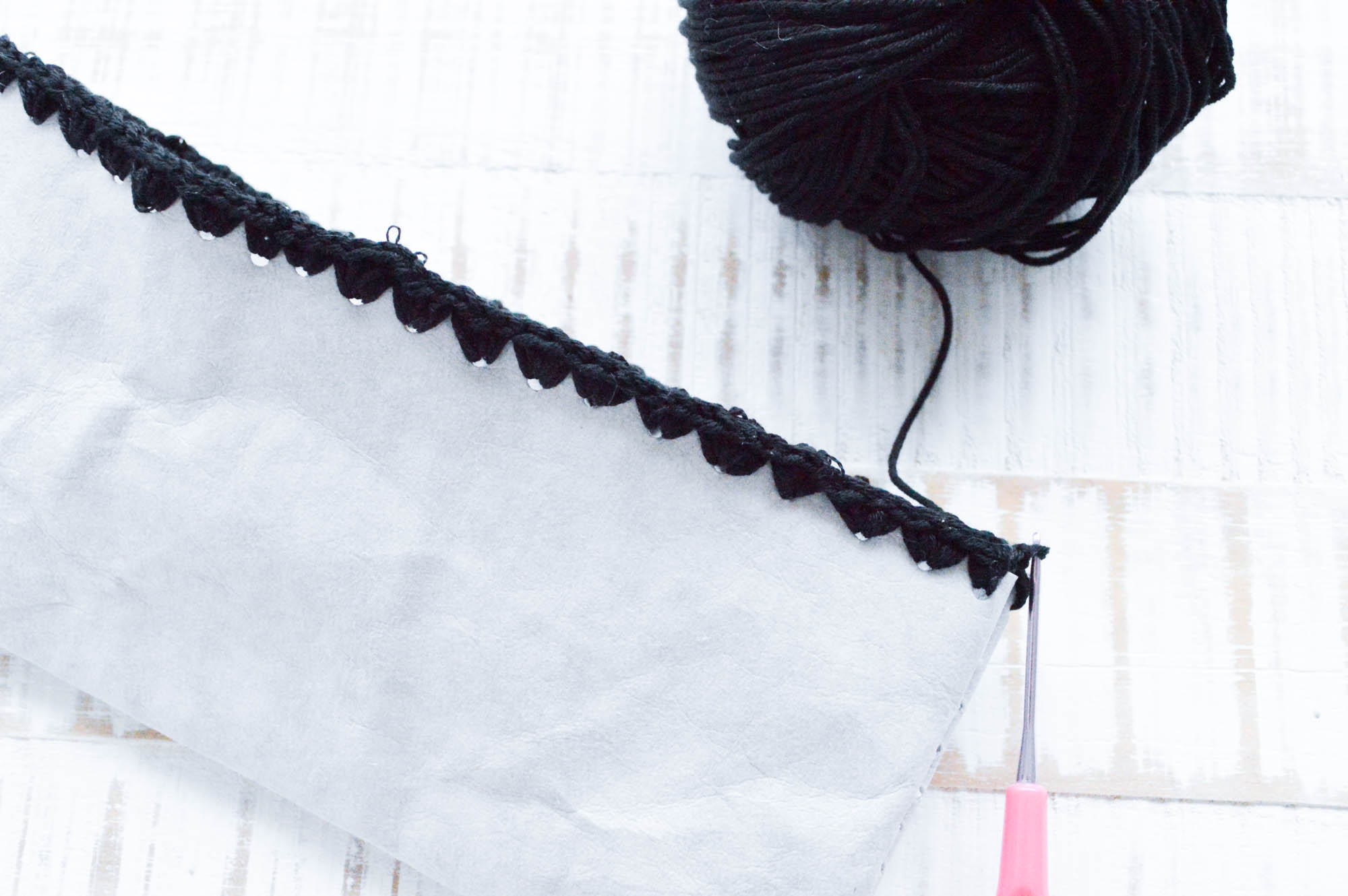 Als nächstes kommen Wolle und Häkelnadel zum Einsatz. Ich habe mich für schwarze Wolle entschieden und eine möglichst dünne Häkelnadel gewählt um gut durch die Löcher zu kommen. Die Tasche wird ab hier im 4er Muschelmuster gehäkelt.