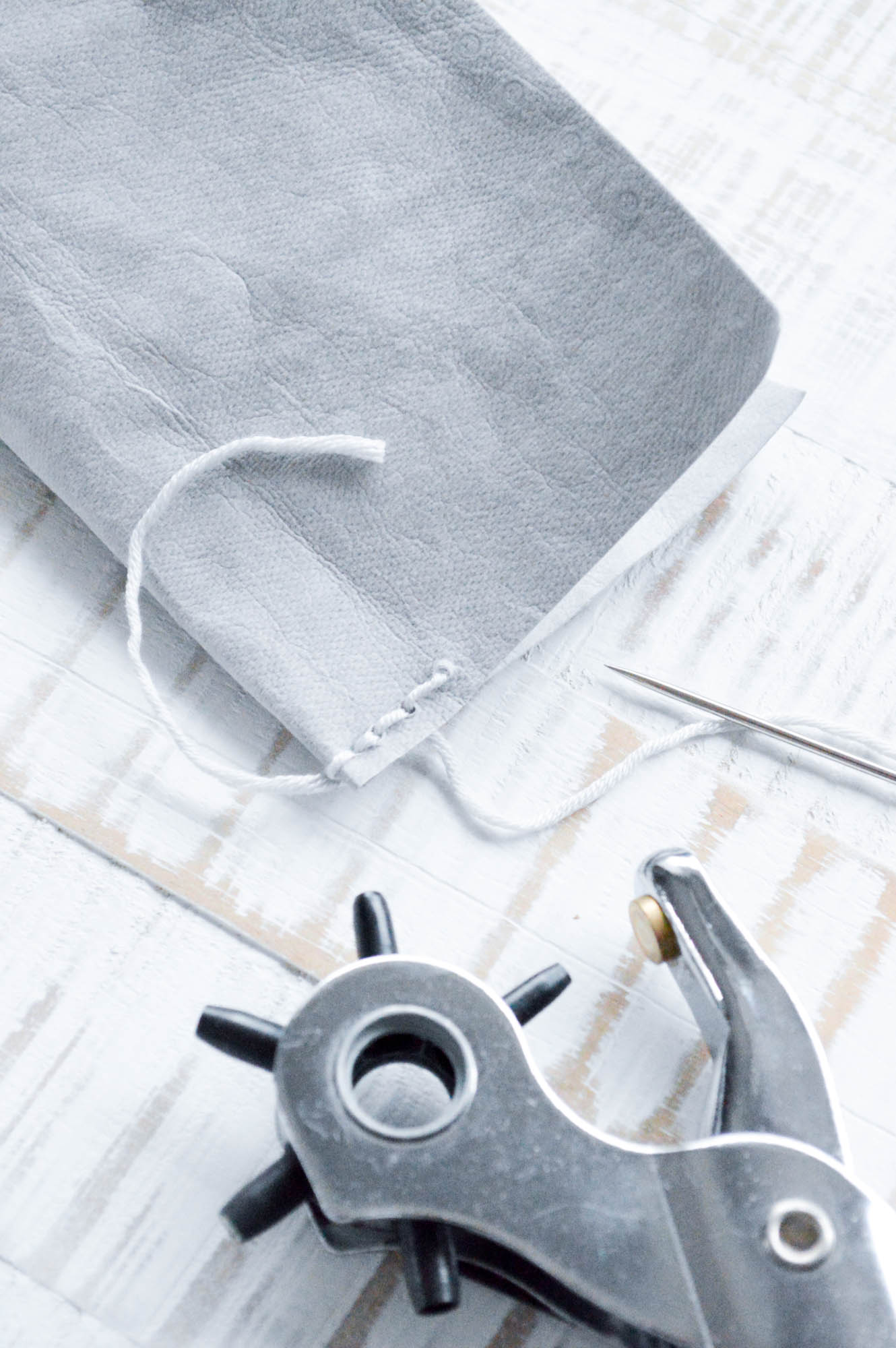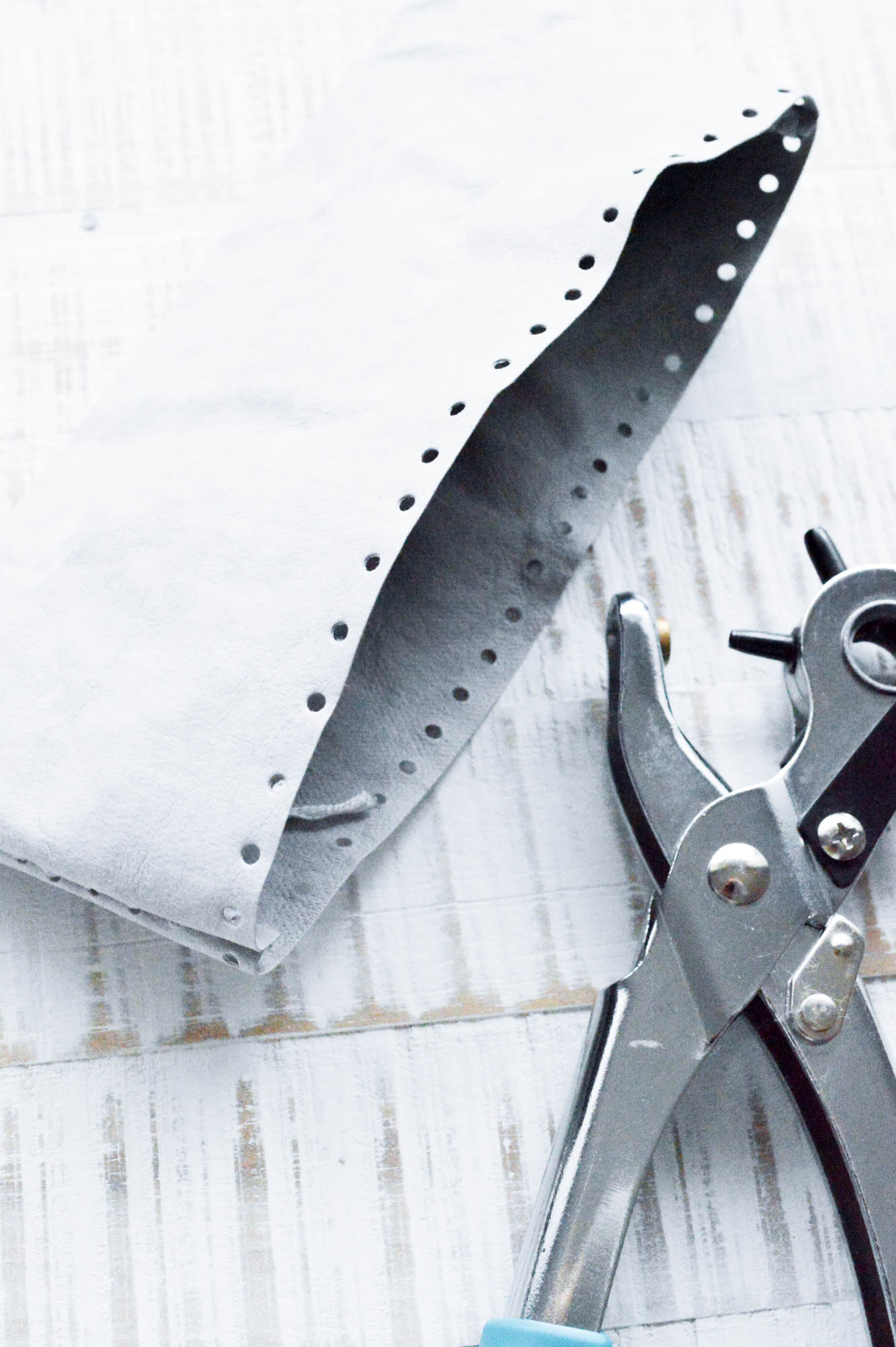 Nun kommt die Lochzange auf kleinster Einstellung zum Einsatz. Stanzt am oberen Rand etwa alle 5-7 mm ein Loch aus, bis das komplette Leder oben „durchlöchert“ ist- sonst könnt ihr später nicht anhäkeln.