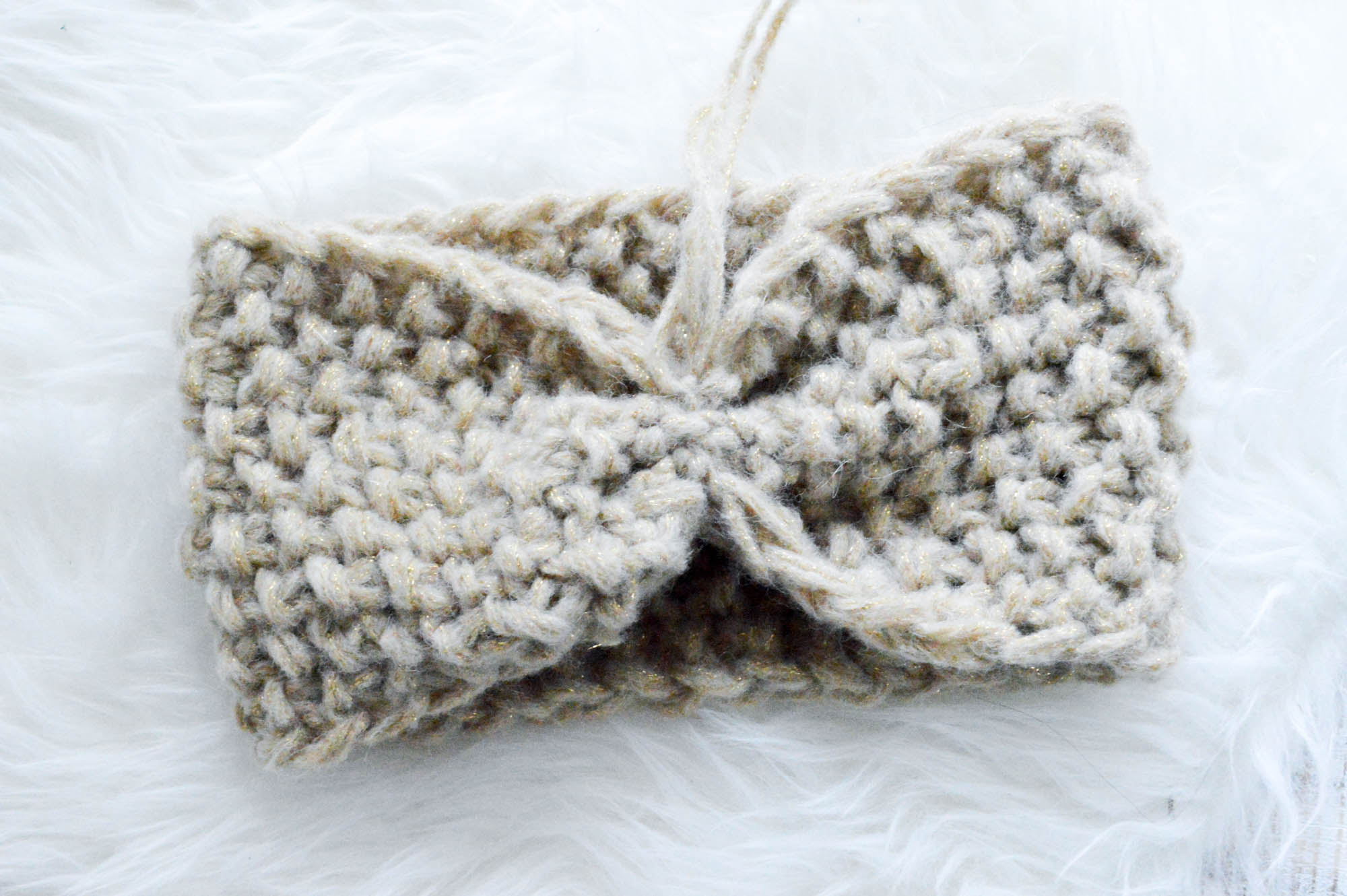 Nach dem Abstricken kommt die Häkelnadel zum Einsatz: mit ihrer Hilfe verbindet ihr die beiden Enden des Bandes so, dass es vollkommen geschlossen ist. Mit den überstehenden Fäden rafft ihr das Band zudem so zusammen, dass ihr später die charakteristische Schleifenform erhaltet.